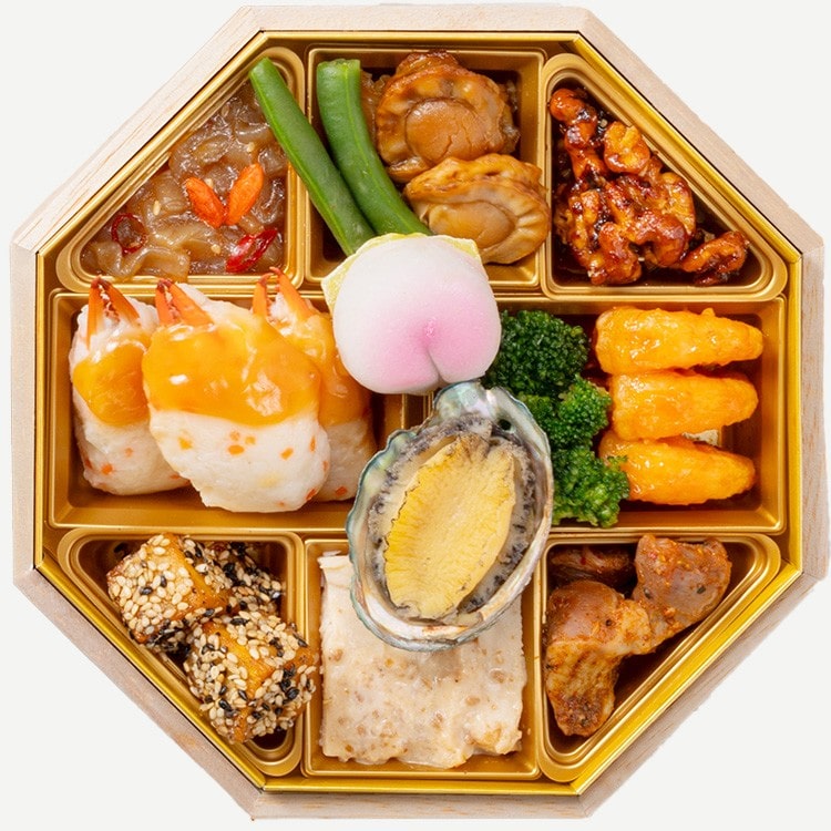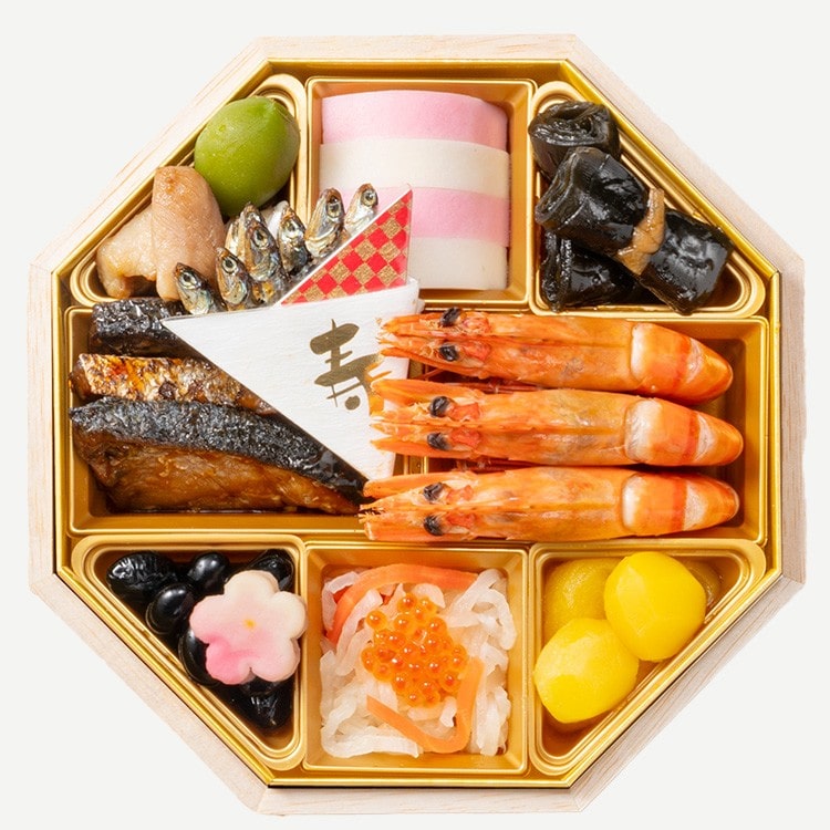 鶏山椒焼、若桃の甘露煮、紅白蒲鉾、一口昆布巻き、ブリの照り焼き、田作り、お祝い海老煮、黒豆煮、花型麩、紅白なます、いくら醤油漬、鳴門金時芋きんとん、栗甘露煮