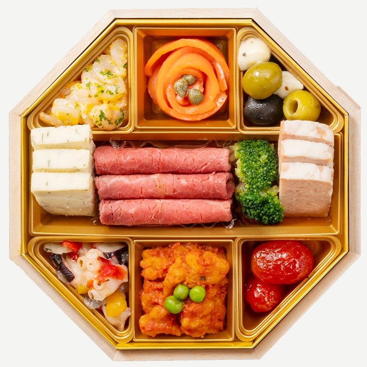 縁起の良い八角お重に家族三世帯それぞれが好きなものを探せる和洋中のお料理を盛り付けました。ホテルならではの洋の段にはローストビーフを大ぶりに盛り付け、見た目も豪華なおせちです。
