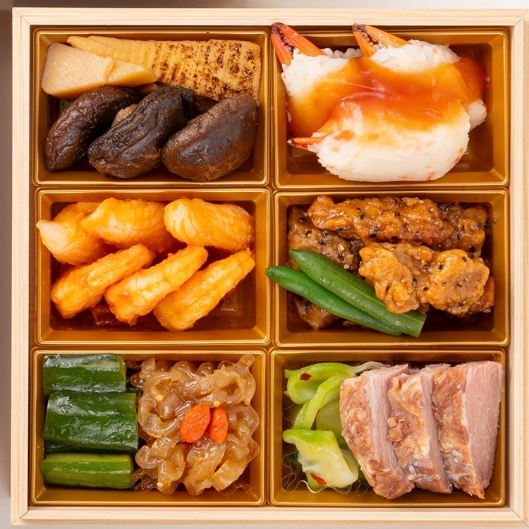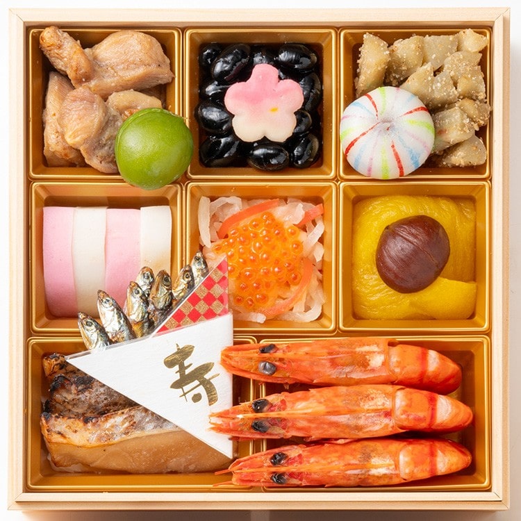 鶏山椒焼、若桃甘露煮、黒豆煮、花型麩、たたきごぼう、てまり餅、紅白蒲鉾、紅白なます、いくら醤油漬、鳴門金時芋きんとん、渋皮栗の甘露煮、田作り、真鯛の幽庵焼、お祝い海老煮