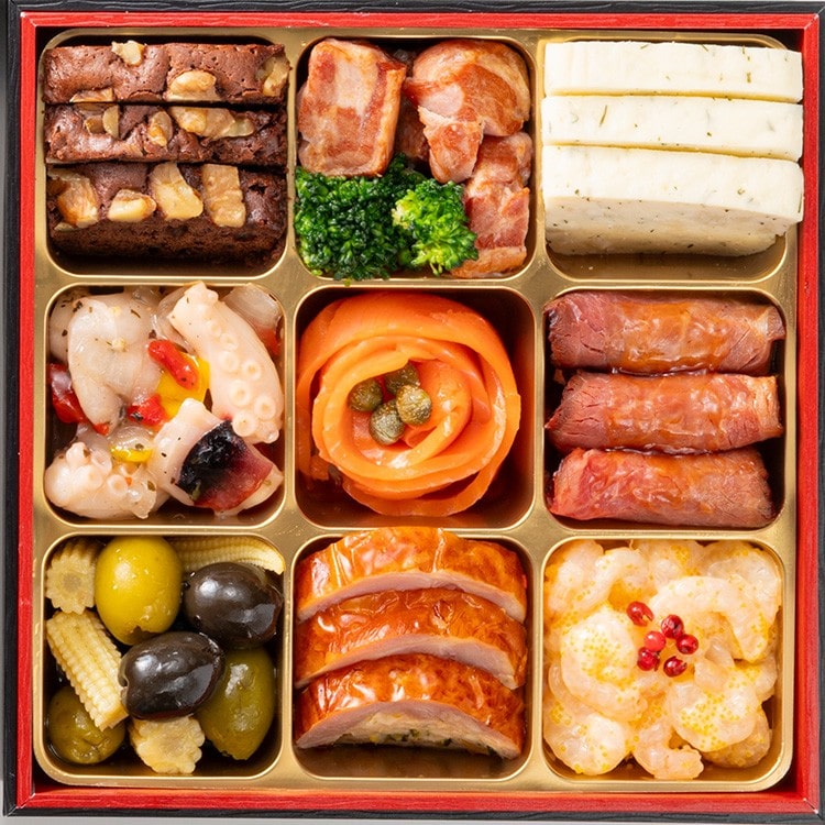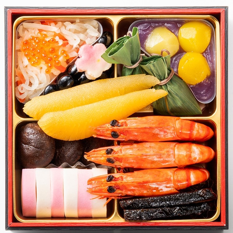 紅白なます、味付いくら、黒豆煮、梅型生麩、紫芋きんとん、栗甘露煮、笹団子、椎茸煮、味付け数の子、紅白かまぼこ、お祝い海老煮、ブリの照焼