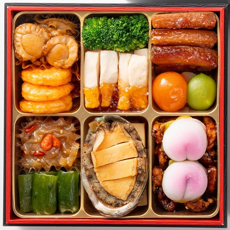 帆立の中華和え、海老チリソース、ブロッコリーのコンソメ風味、蒸し鶏の甘酢ジュレがけ、豚角煮、若桃甘露煮、金柑甘露煮、中華くらげ、胡瓜の甘酢漬、あわびの艶煮、高野豆腐煮、くるみ飴炊き、桃の花餅