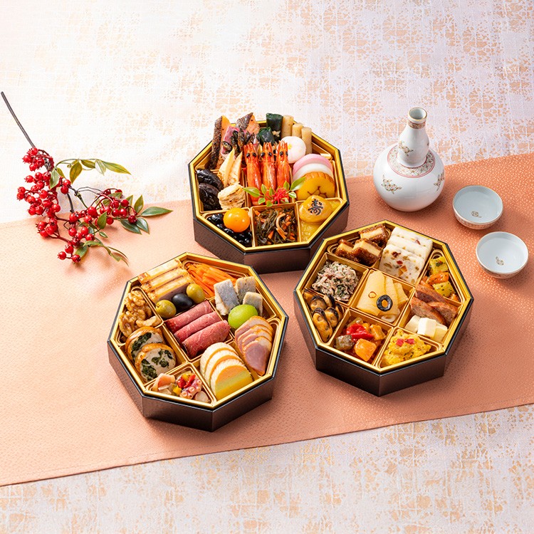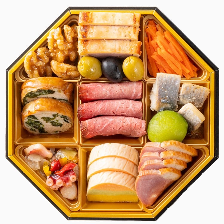 縁起の良い八角のお重に日本の伝統的な食材を盛り込んだ和の段とオードブルテイストの洋風の段、お酒と共にお召し上がりいただけるおつまみ(肴)の段を重ねました。おつまみはビールや白ワインなどライトな洋酒と共にお楽しみください。