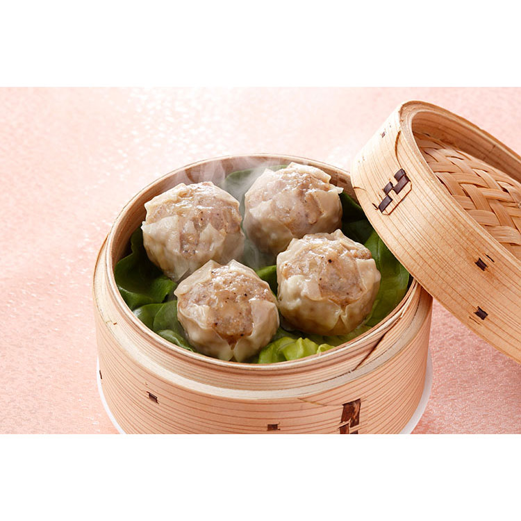 粗挽きの豚肉に、えびとくわい、たけのこ、長ねぎ、しいたけを加えた具だくさんの焼売です。塩、こしょうでシンプルな味付けをしたいますので素材のおいしさがそのまま楽しめます。皮も彩りよく仕上げていますので、温めるだけで夕食のおかずやおつまみ、お弁当のおかずとしてもご利用いただけます。
