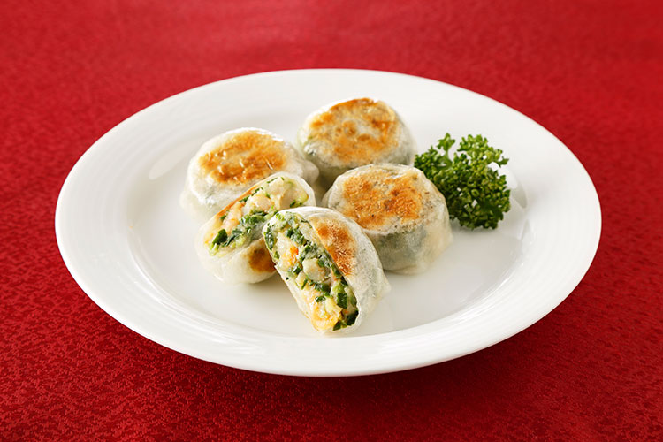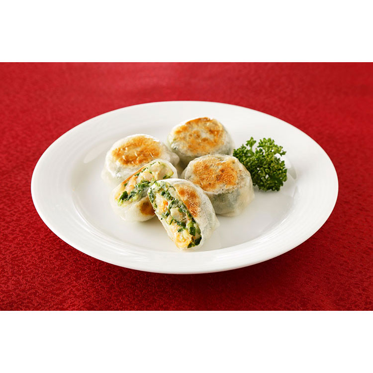 ぷりぷりのえびの入ったにらの風味がおいしいニラまんじゅうです。蒸し器で温めるだけで召し上がれます。フライパンで焼くと、香ばしくなりますのでより一層おいしく召しあがれます。