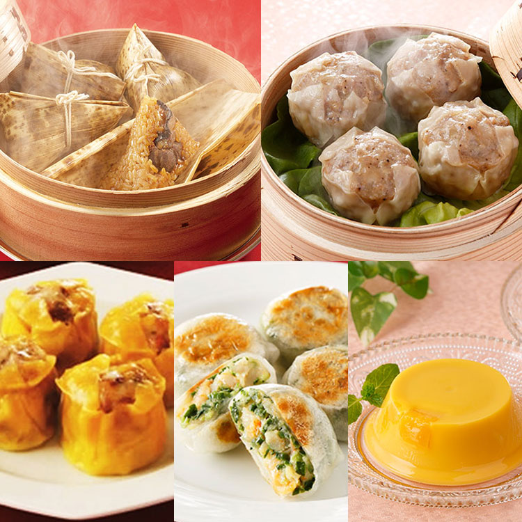 〈日本製〉内容●五目焼売(4個入)120 g、エビにらまんじゅう(4個入)140 g、ジューシー肉焼売(4個入)160 g、肉ちまき(4個入)240 g、マンゴープリン(2個入)120 g×各1袋・計5種5袋 ●冷凍90日