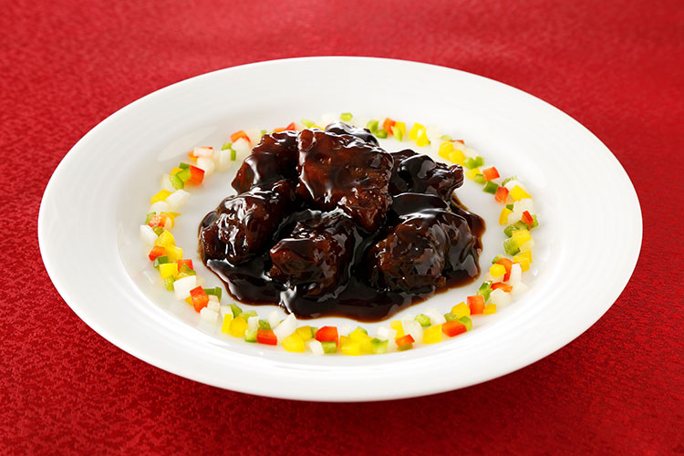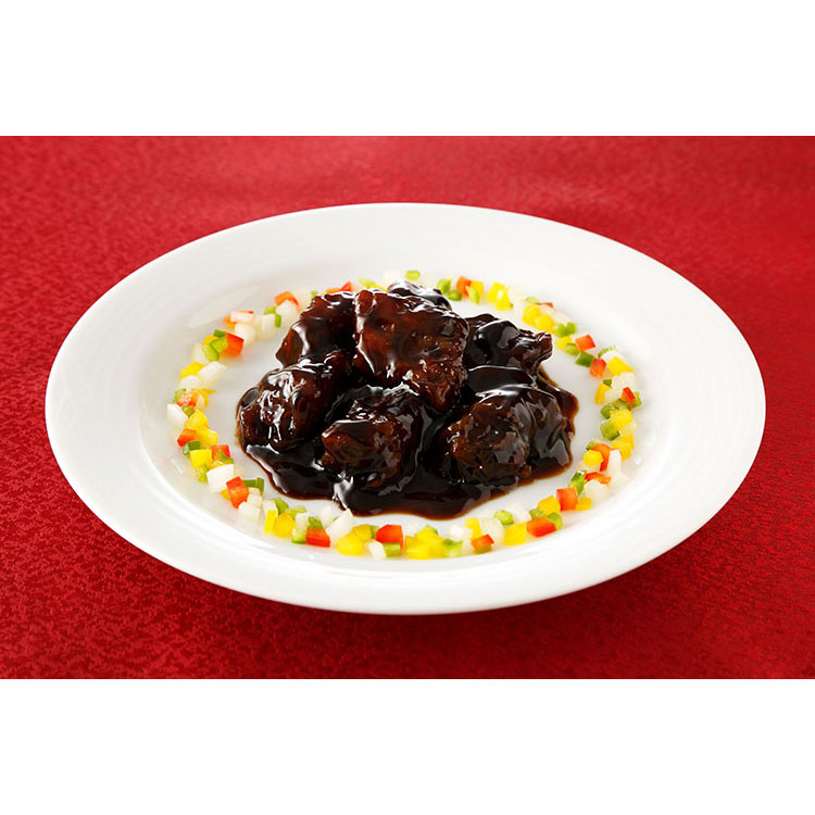 適度に脂の入った豚肩ロースを使用。手切りにて大きさを調整し柔らかく仕上げています。煮詰めた黒醋と、そのままの黒醋を2回に分けて加えるこで、コクと甘味、酸味のバランスが良く、濃厚な味わいはあとを引くおいしさです。お店と同じ調味料のヴィンコット(ぶどう濃縮果汁)、バルサミコ酢を入れ、より本格的な味付けに仕上げました。ソースが多めに入っていますので、ご家庭で野菜(玉ねぎ・パプリカ等)を加えて炒めたり、アイスクリームにかけていただいても大変美味しくお召し上がり頂けます。