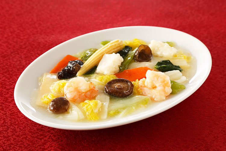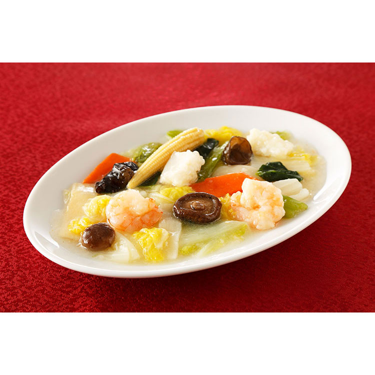 ていねいに下ごしらえしたプリプリのいかとえびを使用し、白菜・チンゲン菜など具のたくさん入った八宝菜です。塩味ベースであっさりとした味付けで、ねぎ油や鶏油を使用していますので、香りとコクがあります。温めるだけで、中華丼の具や、麺類にかけてあんかけ焼きそばや、あんかけラーメンなど幅広い用途のご利用いただけます。