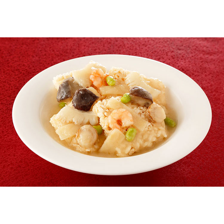 菰田総料理長オリジナルレシピに基づいて作られた海鮮おこげセットです。いか、ほたて、えびのしっかり入りコクのあるねぎ油で風味づけをした塩味ベースのあんをしっかりと揚げたおこげにかけて召し上がりください。おこげは、揚げてありますのでレンジ調理でできます。