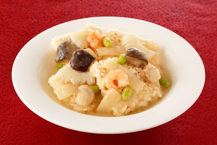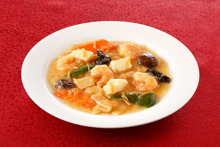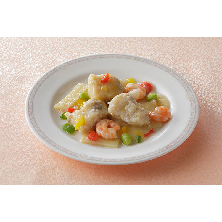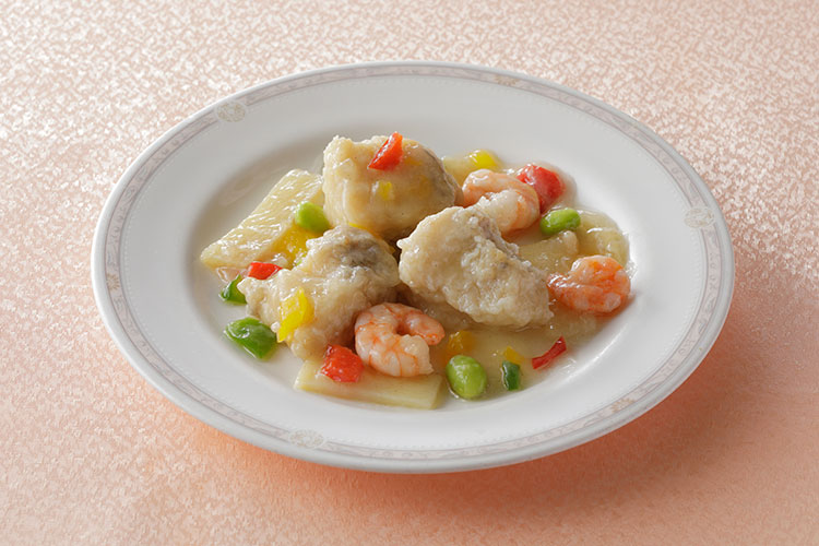 柔らかい身の天然のヒメダイとエビをねぎ油とチキンスープのコクを加え、赤ピーマン・黄ピーマン・枝豆・筍の彩り豊かであっさりとした塩味のやさしい味わいの一品です。