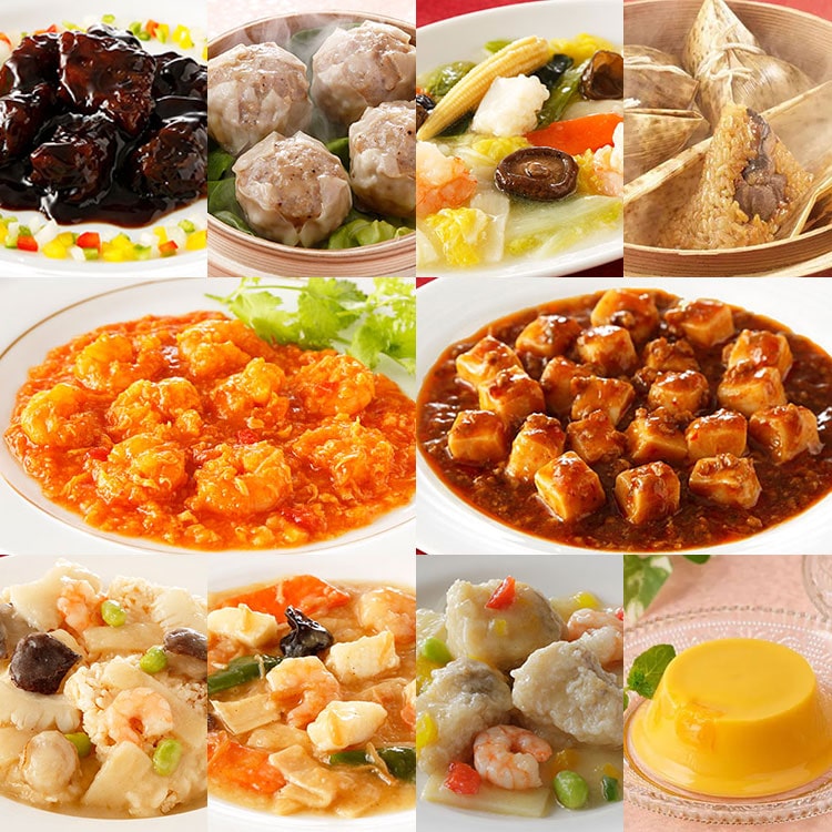 〈日本製〉内容●ズワイ蟹入エビチリソース 130 g、麻婆豆腐(豆腐入り) 150 g、彩り八宝菜 150 g、黒醋酢豚 150 g、海鮮おこげ 210 g、ヒメダイとえびの塩炒め 130 g、エビとイカのXO醤炒め 130 g、ジューシー肉焼売(4個入)160 g、肉ちまき(4個入)240 g、マンゴープリン(2個入)120 g×各1袋・計10種10袋 ●冷凍90日