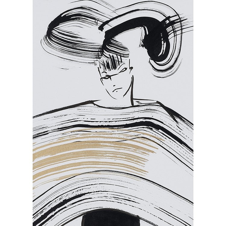 氏はモード画を描く際にはヘアー部分から描き始める。髪型が決まってからフェイスを描き、そしてボディーへと移る。その間わずか数分。まさに頭に浮かんだそのままを瞬時に筆を走らせ表現している。