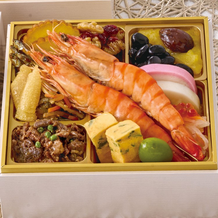 伊達巻、クランベリーくるみ、田作り、鳴門金時芋きんとん、渋皮栗甘露煮、北海道産黒豆、北海道産昆布の松前漬、数の子、雪降り和牛尾花沢のしぐれ煮、青実山椒、かまぼこ(赤)、かまぼこ(白)、焼き海老、紅白なます、いくら醤油漬、九条葱の玉子焼、若桃甘露煮
