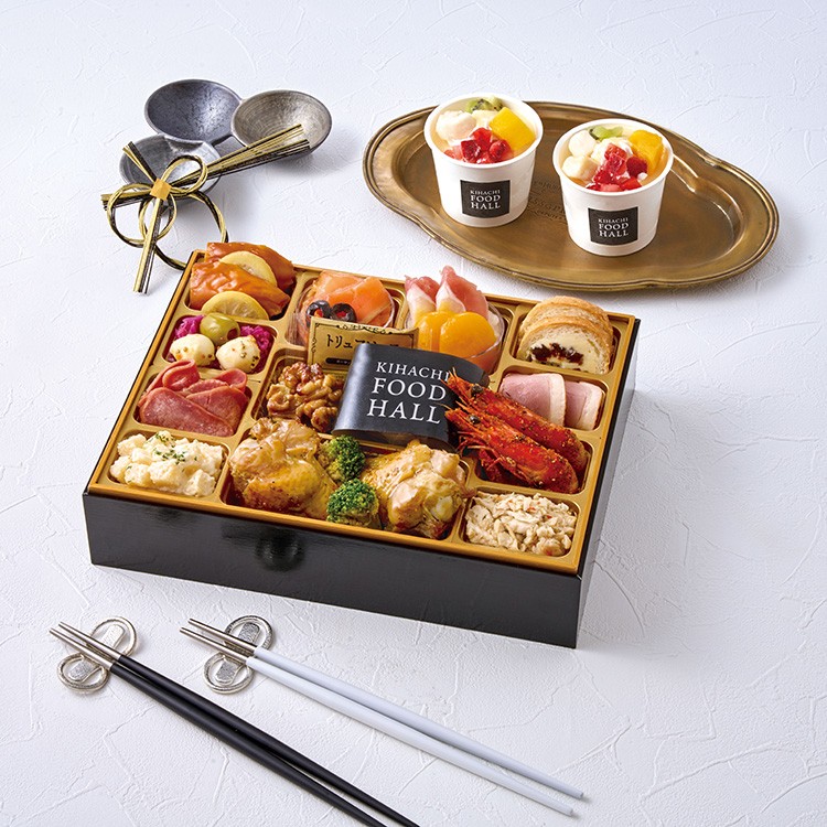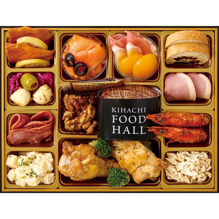お重サイズ(外寸):縦196mm×横256mm×高さ57mm(内寸(1段):39mm)、(21品目+パフェアイス)、(約2人前)【壱の重】伊達鶏の燻製、レモンシロップ漬、レッドキャベツのラペ、モッツァレラチーズのオリーブオイル漬、スタフドオリーブ、キャロットラペ、スモークサーモントラウト、ライプオリーブ、オニオンマリネ、生ハム、杏子煮、レーズンレパン、合鴨スモーク、くるみのキャラメリゼ、ローストビーフ、トリュフソース、豚タン、魚卵のマヨサラダ、華味鳥スパイシー手羽元、ブロッコリー(コンソメ風味)、KIHACHIオリジナルスパイシーシュリンプ、桜島どりマリネチキン