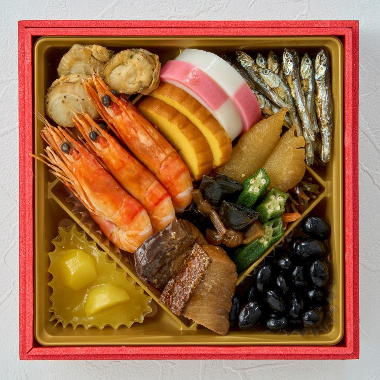 帆立香草焼、田作り煮、紅白蒲鉾、伊達巻、有頭海老、松前漬、数の子、オクラの浅漬、鰊昆布巻、ぶり照焼、きんとん、栗甘露煮、黒豆煮