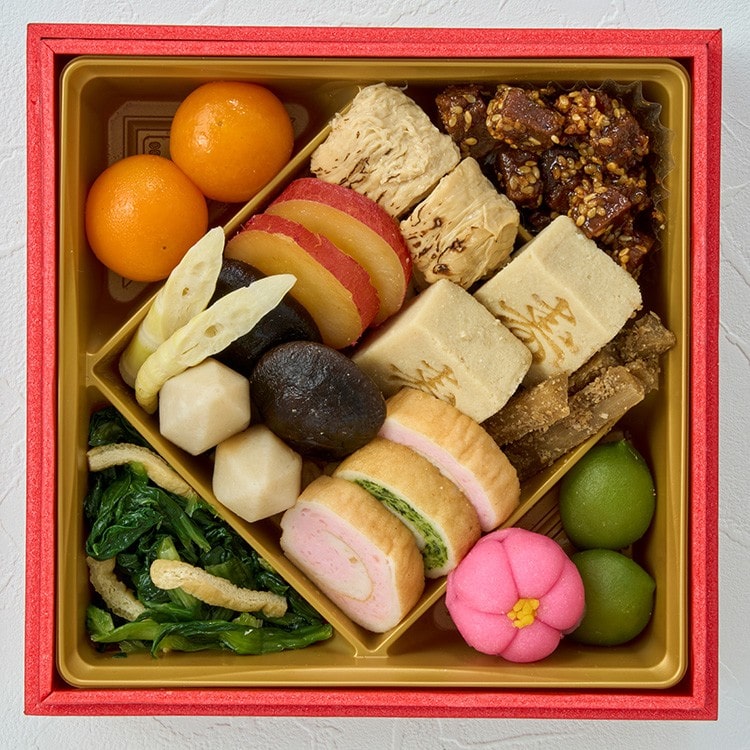 金柑甘露煮、金ごま角煮、焼き湯葉巻、鳴門金時芋レモン煮、寿高野豆腐、姫竹旨煮、椎茸柚子煮、海老芋旨煮、たたきごぼう、の巻(海老)、の巻(ほうれん草)、小松菜と揚げの煮物、若桃甘露煮、花餅紅梅