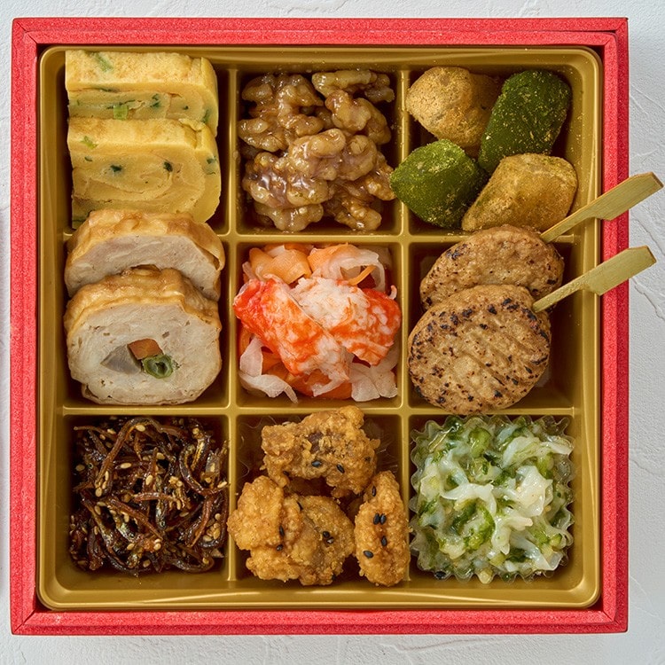 九条葱入り玉子焼、くるみ甘露煮、わらび餅、抹茶わらび餅、若鶏の三色巻、紅白なます、かに風味かまぼこ、鶏つくね串、いかなごかつお節和え、知鳥鶏鶏皮、帆立生姜和え
