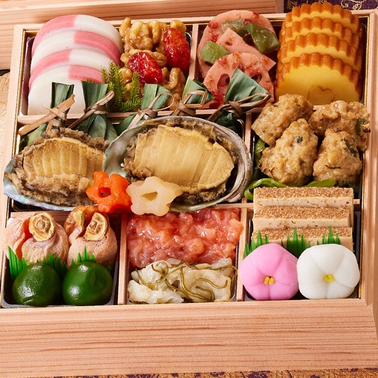 紅白蒲鉾、くるみ甘露煮、塩トマト甘納豆、れんこん梅肉和え、伊達巻、あわび煮、笹巾着よもぎ餅、味付花こんにゃく、軟骨入り鶏つくねの照焼、小松菜と揚げの煮物、市田柿、青梅甘露煮、帆立明太和え、ふぐ刺し昆布、松風、紅白梅餅