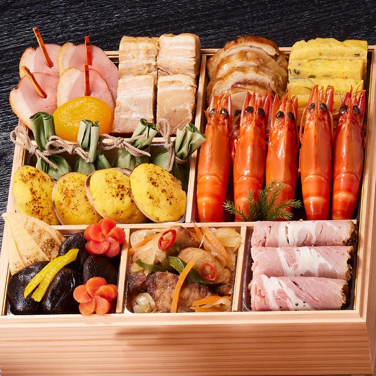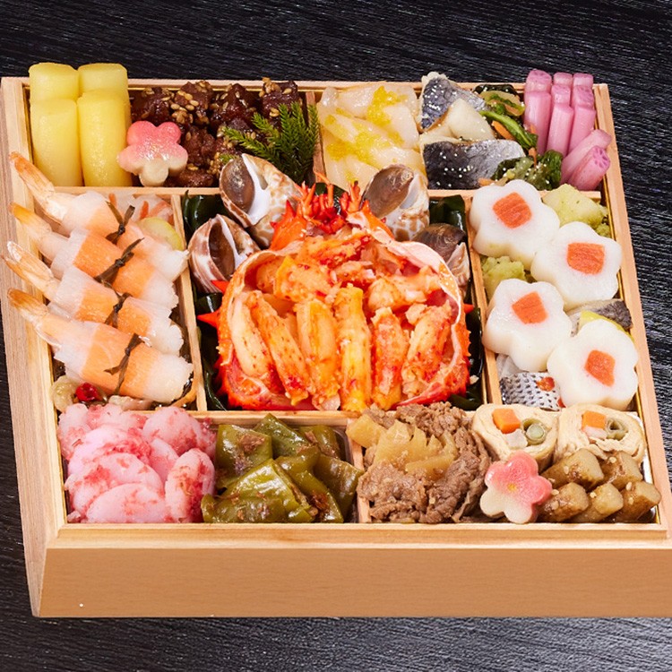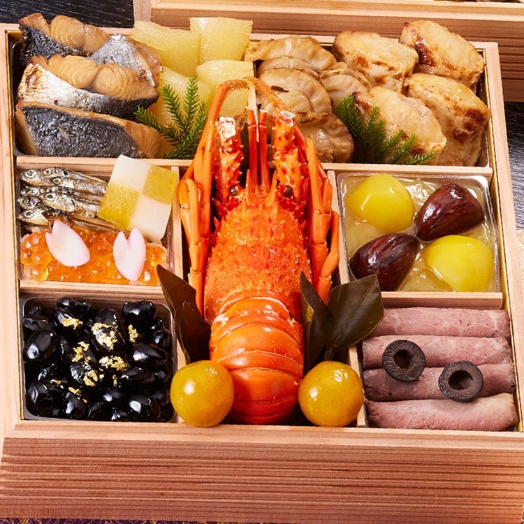 鰆柚庵焼、味付数の子、焼帆立、甘鯛西京焼、田作り煮、金柑百合根市松、花びら百合根、いくら醤油漬、紅白なます、金箔黒豆煮、ボイルロブスター、金柑甘露煮、栗甘露煮、渋皮栗甘露煮、きんとん、ブラックオリーブ、ローストビーフ