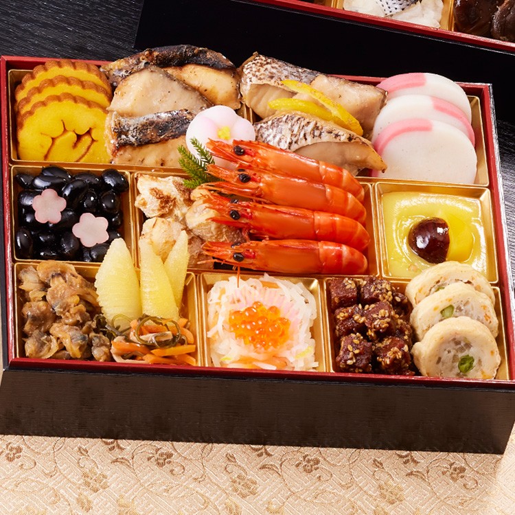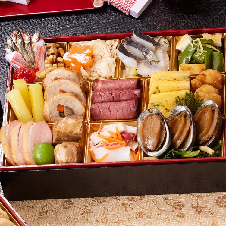 海の幸、山の幸をふんだんに使用し、黒豆、田作り、数の子などのおせちの定番料理に加え、魚介、肉料理などを、南蛮漬や西京漬などバリエーション豊かな調理方法を用い、バランスよく見た目も色彩豊かで華やかな60種のおせち料理に仕上げております。
