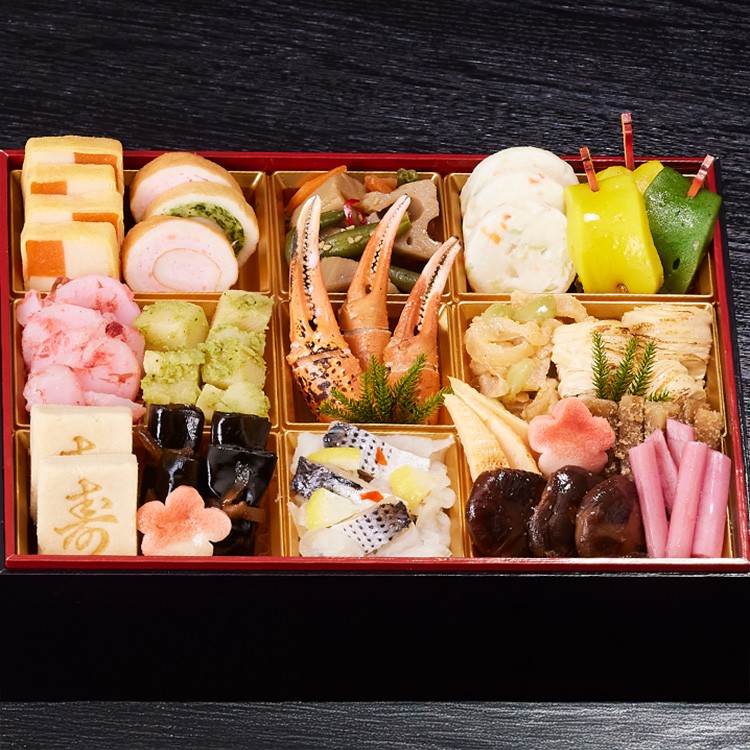 伊達巻、カゴカマス西京焼、花餅紅梅、真鯛柚庵焼、柚子皮、紅白蒲鉾、梅百合根羊羹、黒豆煮、小鯛西京焼、海老の旨煮、渋皮栗甘露煮、栗甘露煮、きんとん、あさりの佃煮、味付数の子、松前漬、いくら醤油漬、紅白なます、まぐろ角煮、味付笹がき信田巻