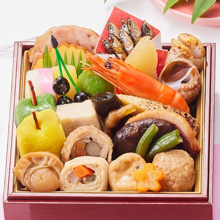 鶏塩麹焼、伊達巻、白かまぼこ、紅かまぼこ、黒豆金箔松葉串、さつま芋レモン煮、若桃甘露煮、田作り煮、小鯛西京焼、味付バイ貝、味付数の子、海老の旨煮、蓬麩含め煮、粟麩含め煮、焼帆立、牛肉八幡巻、穴子八幡巻、湯葉三色巻、味付高野豆腐、にしん昆布巻、味付焼筍、椎茸旨煮、合鴨スモーク、ひろうすとインゲンの煮付、鶏団子、梅人参含め煮