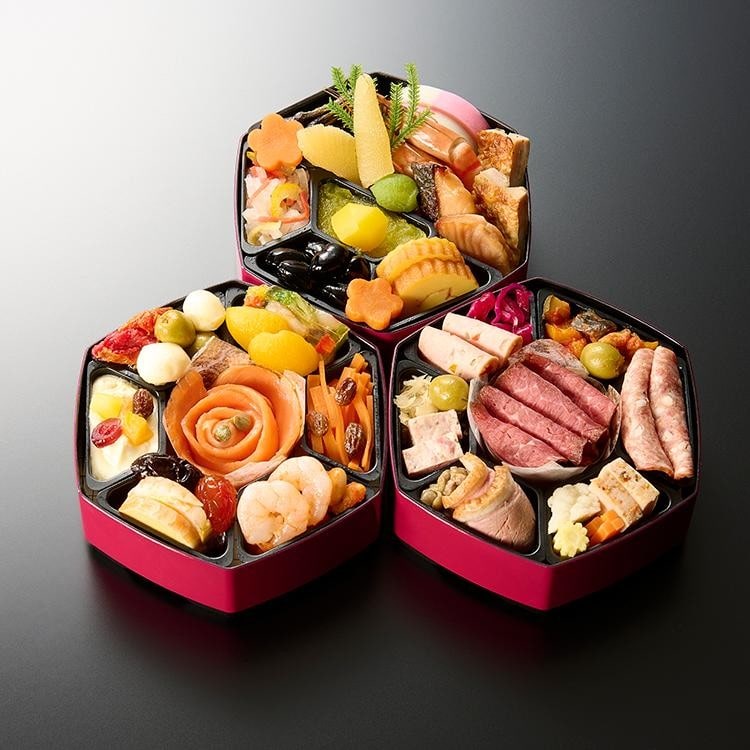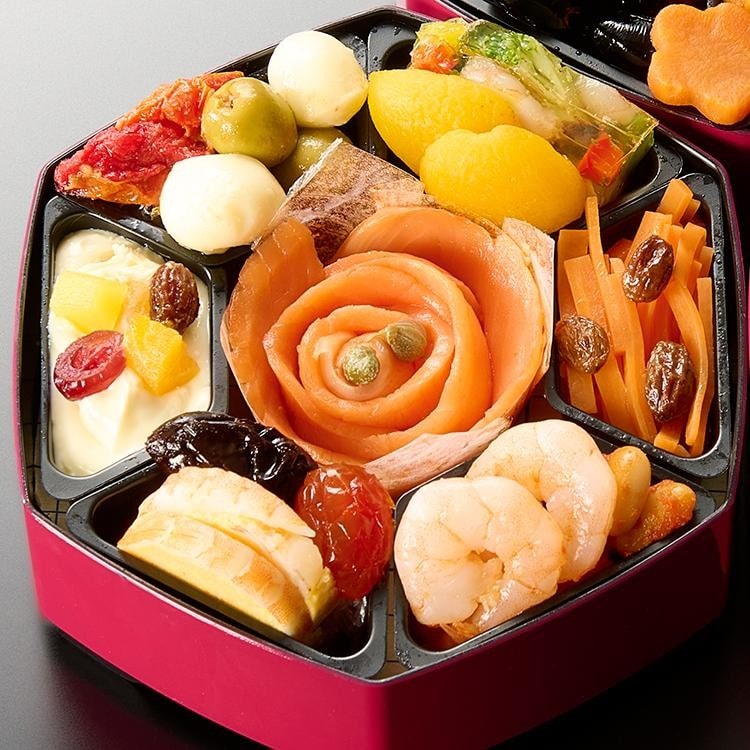 田作り、紅白蒲鉾、海老の姿煮、鶏の香味焼、数の子醤油漬、鮭西京焼、花人参、紅白なます、栗金団、若桃甘露煮、伊達巻、黒豆の煮豆