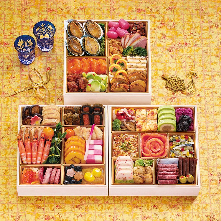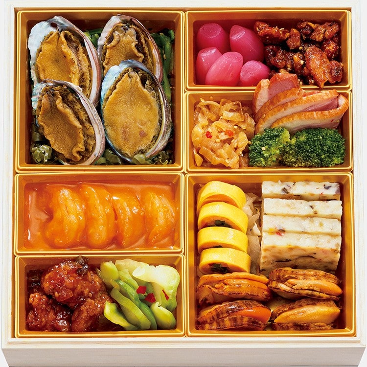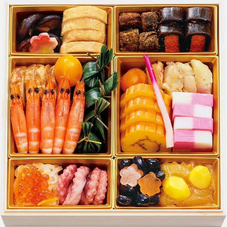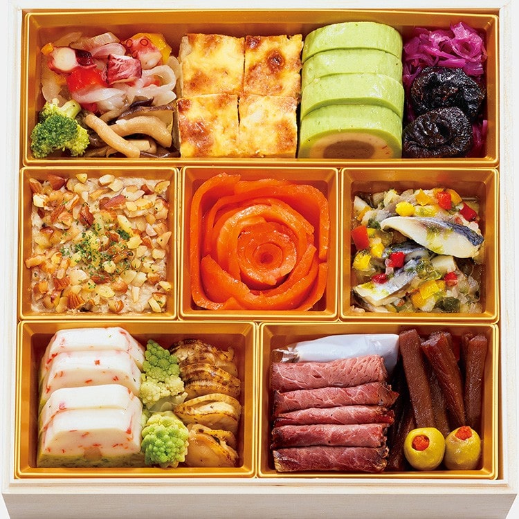 梅麩含め煮、椎茸旨煮、かに信田、鮎土佐煮、鱈子昆布巻、鶏肉八幡巻、牛しぐれ笹包み、祝海老、金柑、赤魚西京焼、伊達巻、はじかみ、市松かまぼこ、なます いくら添え、蛸旨煮、梅型寒天、黒豆、栗金団