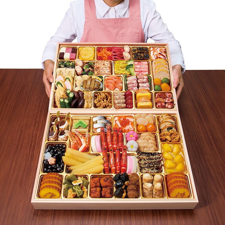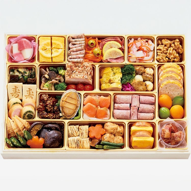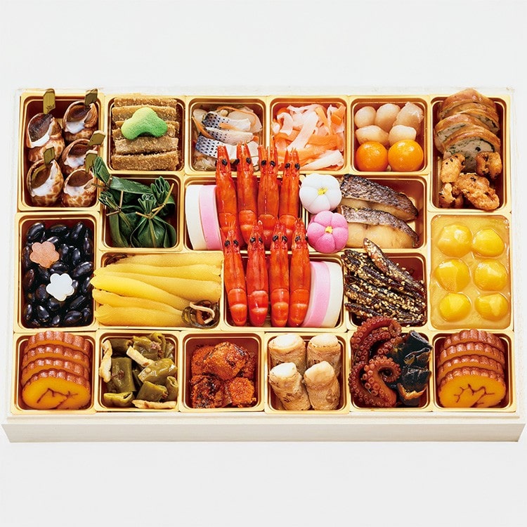 バイ貝旨煮串、たたきごぼう、松麩、こはだかぶら、紅白なます、白花豆、金柑、若鶏鳴門巻、鶏皮揚げ、黒豆 梅型寒天添え、牛肉笹包み、蒲鉾 白、蒲鉾 紅、祝海老、花餅 白梅、花餅 紅梅、真鯛幽庵焼、味付数の子、松前漬、わかさぎの胡麻和え、栗甘露煮、きんとん、伊達巻、万願寺と焼京揚げの醤油和え、真だら子旨煮、小鯛俵焼、一口昆布巻、たこ照焼