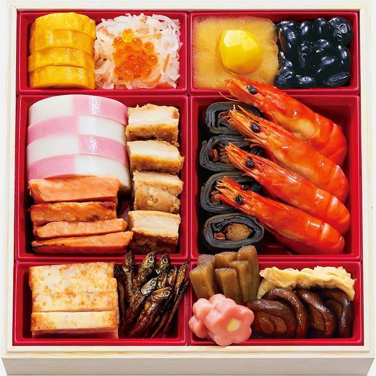 柚子伊達巻、膾 いくら添え、栗金団、黒豆、紅白市松蒲鉾、銀鮭塩焼、鶏鍬焼、鰊昆布巻、祝海老、烏賊と玉葱の揚げ蒲、田作り、牛蒡田舎煮、梅麩、湯葉含め煮、椎茸旨煮