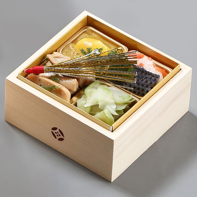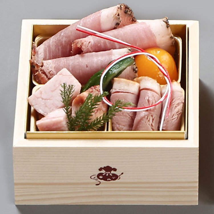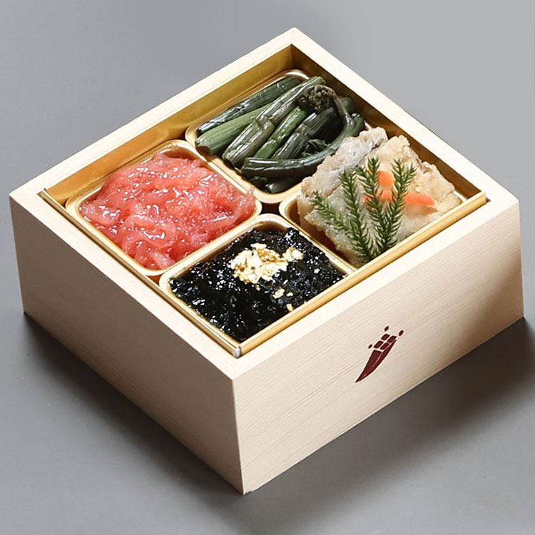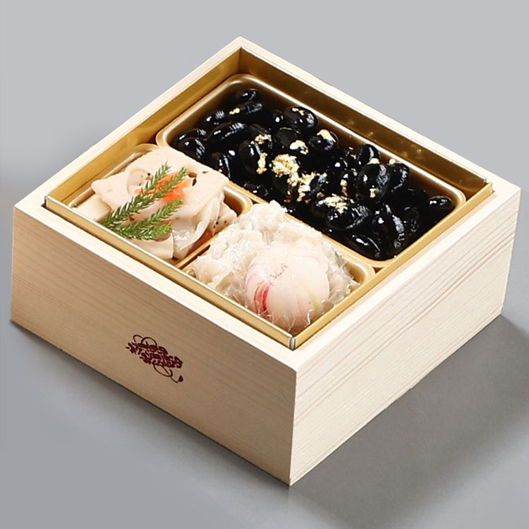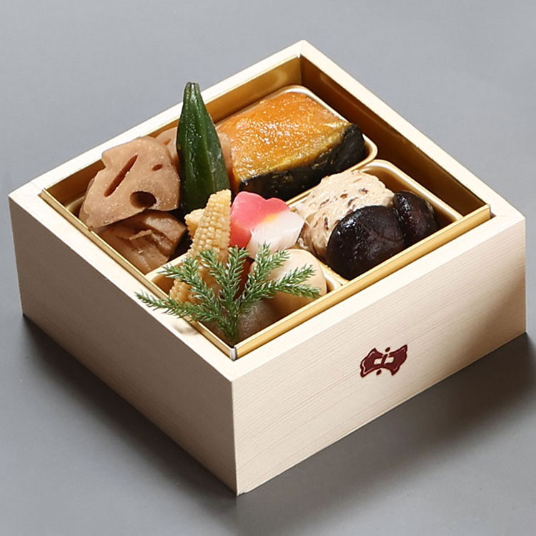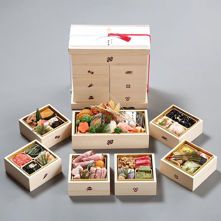 特徴のある七つの枡で構成された重箱、それぞれの枡には縁起の良い伝統的な絵柄が記されております。1の重(打出の小槌 大黒様の宝物)は吹き寄せ、2の重(分銅 財物の重さ)3の重(巻物 秘宝の書)4の重(丁字 希少な香草)5の重(七宝 仏典の貴重な宝)6の重(金嚢 お金の袋)7の重(宝珠 宝の珠)にはそれぞれお正月を寿ぐおせち料理を少量ずつ盛り込みました。