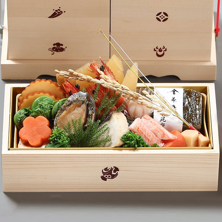 お正月に相応しく縁起の良い宝尽くしの文様が入った七つのお重にお肉料理・昆布〆・煮物や焼物の吹き寄せなど多彩な味わいを盛り込みました。