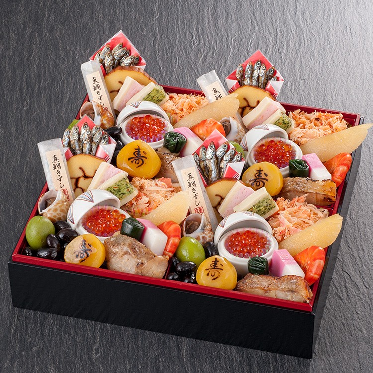 田作り、伊達巻、真鯛きずし、味付高野(海老)、味付高野(ほうれん草)、ばい貝旨煮、一口昆布巻、若桃甘露、カニマリネ、数の子、いくら(手まり陶器入り)、海老旨煮、紅白市松かまぼこ、赤魚酒粕焼、黒豆、寿 栗甘露煮