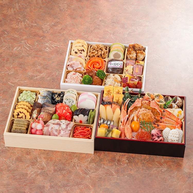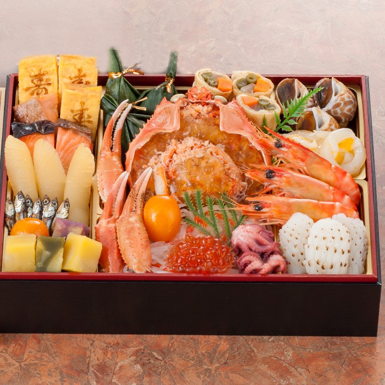 寿玉子、鮭味噌焼、数の子、田作り、栗きんとん寄せ、抹茶栗きんとん寄せ、紅芋栗きんとん寄せ、きんかん煮、牛しぐれ笹包み、信田巻含め煮、かにほぐし身甲羅盛り(かに酢ジュレ)、かに爪、紅白なます、いくら、いいだこ酢漬、ばい貝旨煮、いか黄金、海老艶煮、いか松笠