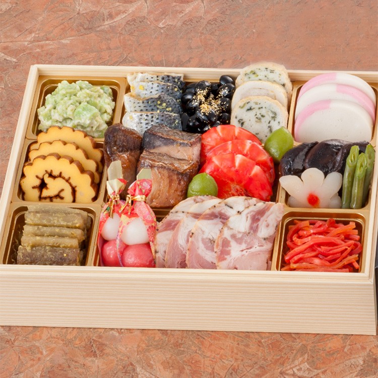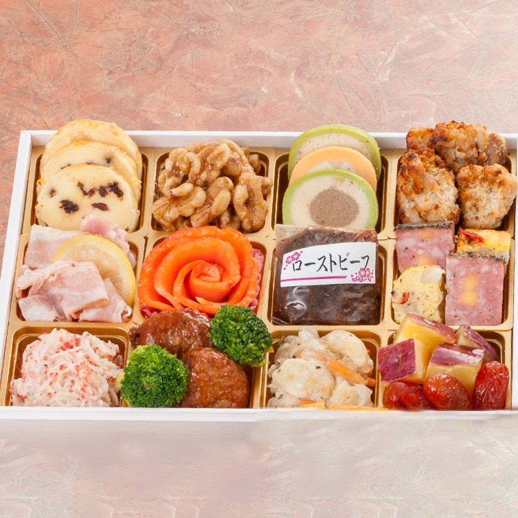 真砂ずんだサラダ、こはだ粟漬、黒豆金箔、広島菜信田、かに信田、紅白かまぼこ、伊達巻、ぶり照焼、焼えびスモーク風味、若桃甘露、椎茸煮、花こんにゃく、味付いんげん、ごぼう西京漬、友禅紅白串、ポークパストラミ、京人参なます ごま風味