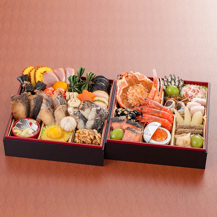 かにほぐし身甲羅盛り(かに酢ジュレ)、かに爪、田作り、若桃甘露、蟹とあおさのサラダ、松前漬、ばい貝旨煮、紅新丈、黒豆金箔、トラウトサーモン味噌焼、海老旨煮、いくらなます(手まり陶器入り)、数の子、たたき牛蒡、白ばい貝炙り