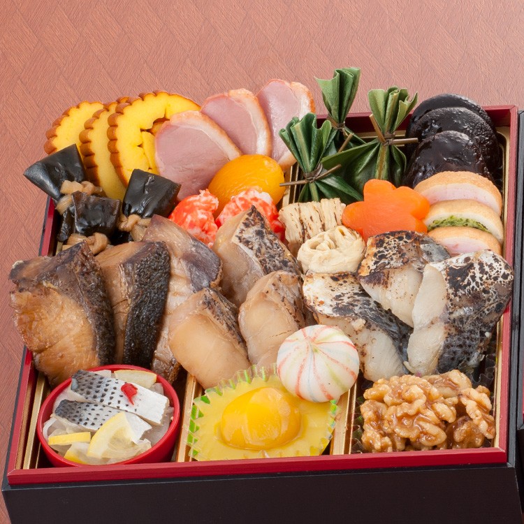 伊達巻、一口昆布巻、合鴨スモーク、あんず煮、たらば風味かまぼこ、牛しぐれ笹包み、椎茸煮、一口焼湯葉、花こんにゃく、なごみ巻海老、なごみ巻ほうれん草、ぶり照焼、こはだレモン、真鯛幽庵焼、栗きんとん 、手まり餅、鰆味噌焼、くるみ甘露煮