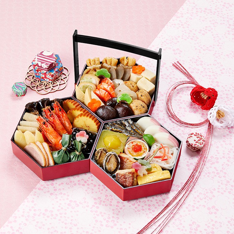 縁起の良い亀甲型の手桶三段重に、色とりどりの祝い料理を31品目詰合せ、少人数のご家族でも楽しんで頂ける様仕上げました。