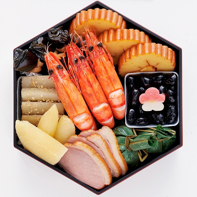 一口昆布巻、伊達巻、たたきごぼう、お祝い海老、黒豆、梅餅、数の子醤油漬、笹団子、合鴨ロース