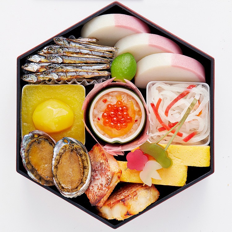 田作り、紅白蒲鉾、栗きんとん、帆立ひもの柚子和え、いくら醤油漬、金時人参入り生酢、あわび旨煮、赤魚西京焼、だし巻、お祝い松葉串、若桃甘露煮