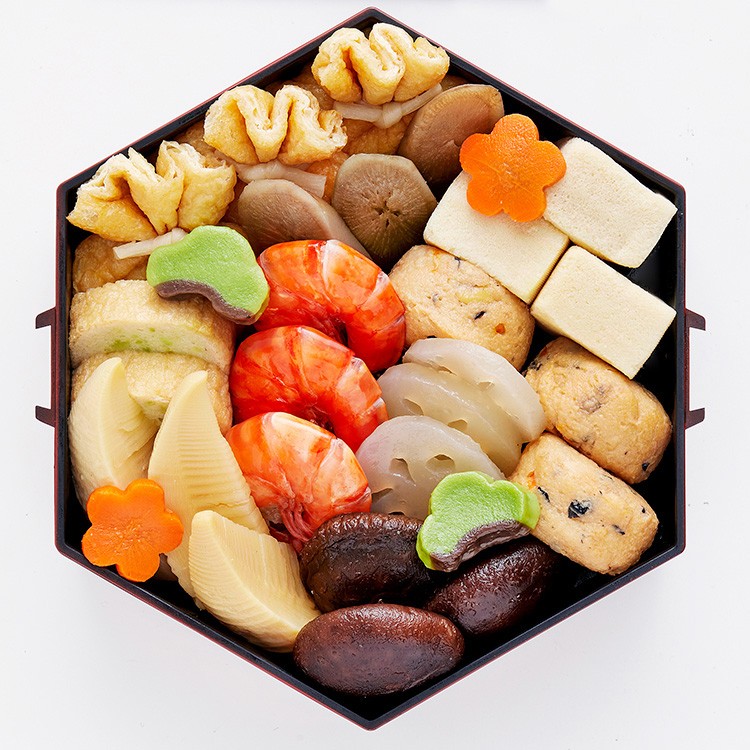 餅巾着旨煮、高野豆腐の含め煮、ごぼう煮〆、黒豆がんも含め煮、枝豆入り信田巻、海老旨煮、蓮根型こんにゃく、筍煮〆、椎茸旨煮、松麩、梅型人参