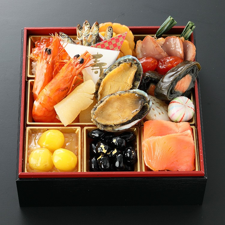 かぶらの甘酢漬、いくら醤油漬、伊達巻、牛しぐれ笹包み、鮎家の紅鮭昆布巻、海老艶煮、味付け数の子、味付田作り、鮑味付、スモークサーモントラウトスライス、サーモントラウトときのこのマリネ、てまり餅、紅茶鴨スモークスライス、ドライトマト赤ワイン煮、栗きんとん、黒豆煮 金箔のせ、松笠いか白焼