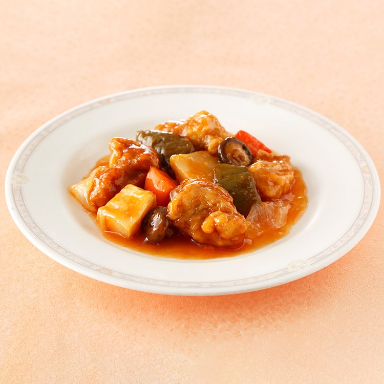 豚肉、たまねぎ、にんじん、筍、ピーマンが入ったケチャップベースのベーシックな酢豚です。丁寧に下ごしらえした豚肉は柔らかく、ふんだんに入った彩り豊かな野菜が目も楽しませてくれます。誰にでも好まれるケッチャップベースのまろやかでコクのある味付けの甘酢ソースが食欲をそそります。