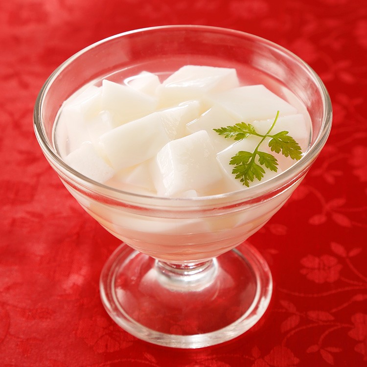 赤坂四川飯店のレシピにより作られた杏仁豆腐です。杏仁霜のほのかな香りとさわやかな甘味がありさっぱりとしているのが特徴です。特に中華料理を食べた後の締めに最高です。ひし形にカットされていますので解凍して器に移して召し上がれます。
