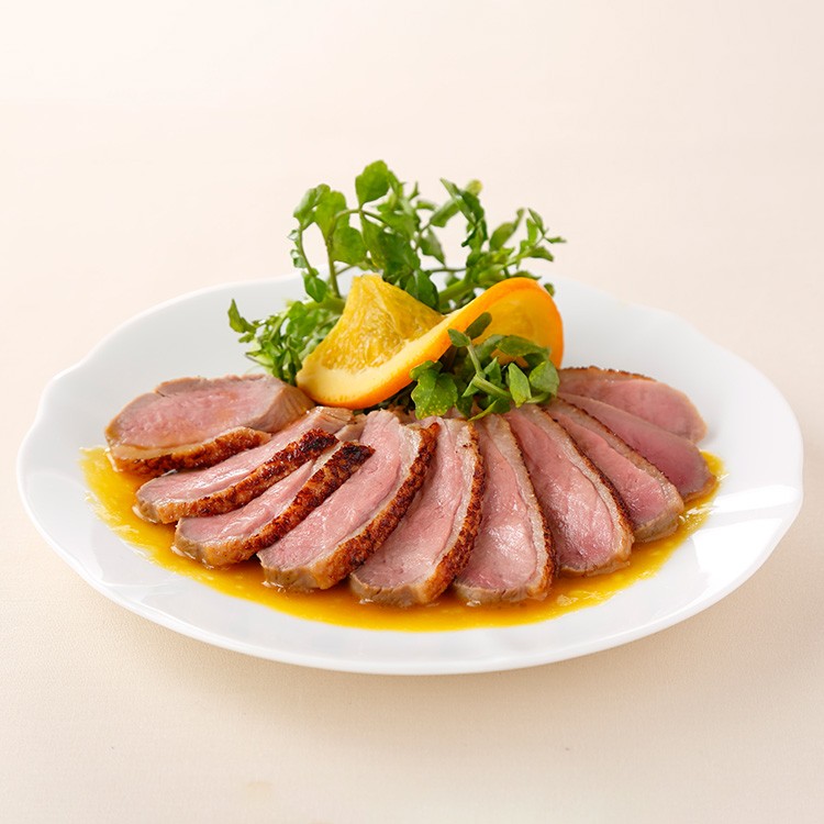 しっかりと焼き上げた合鴨肉に、フレッシュオレンジとにんにくを加えた程よい甘みと酸味のあるオレンジソースを加え真空調理しました。しっとりとした肉感とフルティーなソースが特徴です。