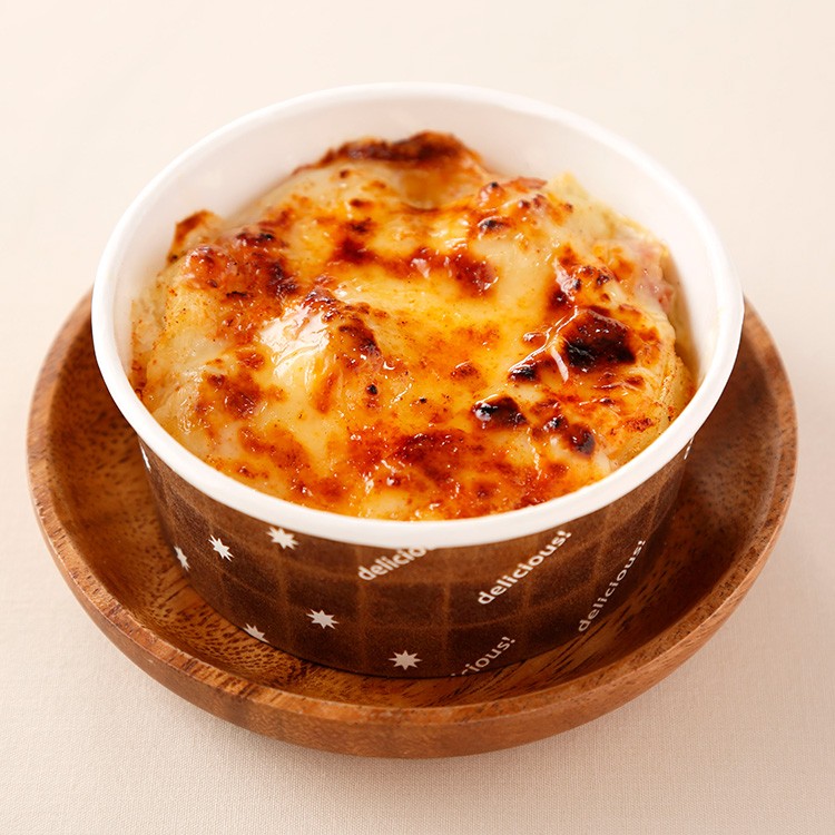 しっとりと蒸しあげたじゃがいもに、スペイン産のハモンセラーノ(生ハム)を加えたクリームソースに、ナチュラルチーズをかけ香ばしく焼き上げました。レンジで温めてお召し上がりください。