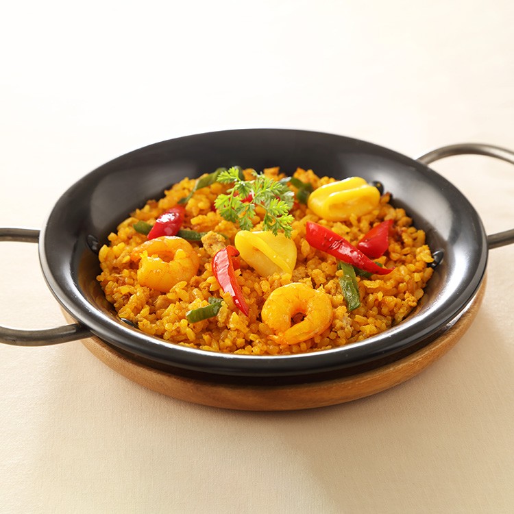 スペインバルモンテルセーロで出されている人気のパエージャの味を再現しています。お米は国産米を使用し、パエリアのおいしさであるご飯の固さにこだわりがあります。「ふっくらとしたお米」「お焦げ」と二段階のかたさと香りの味わいを楽しめるようご飯を炊き上げています。具材として、豚肉、鶏もも肉、えび、するめイカ、玉ねぎ、ピーマン、赤ピーマンを使用した具だくさんタイプです。電子レンジ袋入りですので、冷凍から約3分温めるだけで召し上がれます。