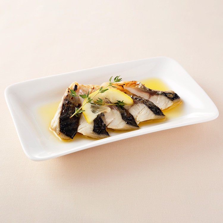 脂ののったサバをスチームしフレッシュレモン、タイムをのせにんにくを加えたオリーブオイルで和えました。さわやかレモンの風味が特徴です。