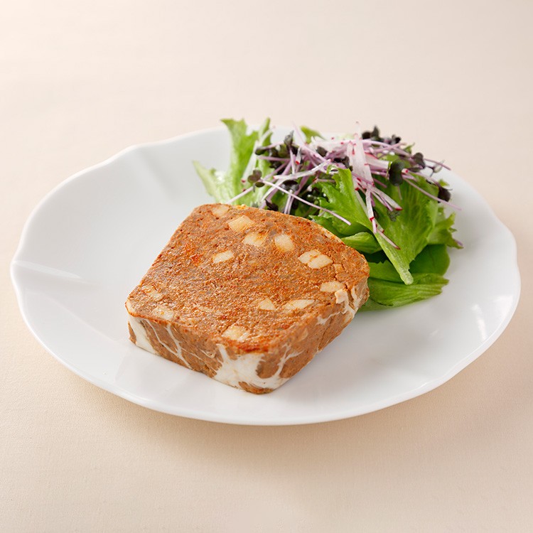 豚赤身肉、鶏ムネ肉、鶏レバーに豚脂を加え、スペイン産の燻製パプリカパウダー、にんにくに少量のブランデーなどを加え、テリーヌ型に、豚の網脂を丁寧に手詰めし蒸し上げました。焼いても美味しいテリーヌです。