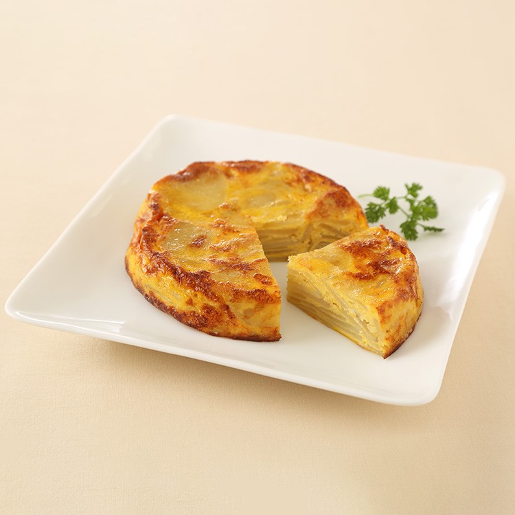 スペイン風オムレツとは、平らに丸く焼いたオムレツのことです。ニンニクを加え本格的な風味を出したオリーブ油を使用し、ジャガイモ、タマネギを低温でじっくりと炒め、塩で味付けをした卵に混ぜオーブンで焼き上げました。特注の丸型で焼き上げていますので、本格的な丸い形仕上がっています。具材がたっぷりを焼きあげていますので、湯煎で温めるだけで簡単に召し上がれます。くさび形に切り分けて召し上がりください。