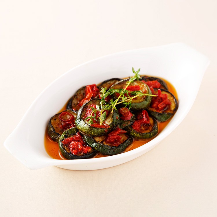 香ばしく焼き上げたズッキーニに、オイル漬けのドライトマトを加え、ガーリック風味のオリーブオイルでマリネしました。ドライトマトの程よい酸味がくせになります。